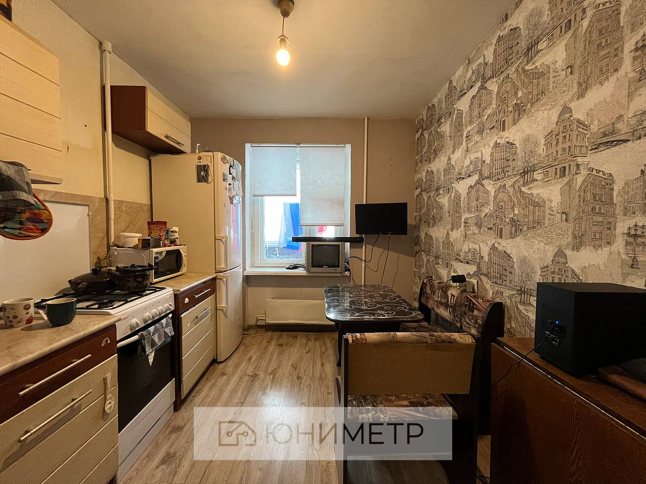 Из мебели остаётся - кухонный гарнитур с газовой плитой, бойлер в ванной комнате.